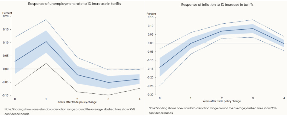 Latest economic data point to the resilience of the US economy, with household spending increasing to 0.5% m/m (0.3% previously), while both headline and core PCE came in in line with expectations at 2.8%. Although the labour market is sending mixed signals, the overall picture suggests that the Fed’s wait-and-see policy is well calibrated. At the same time, as the Fed seeks to preserve its independence, it is unlikely to cut more than what is already projected unless strictly necessary. The December dot plot shows that the Fed is expected to cut once this year, while the market is pricing in almost two cuts. A serious threat or imposition of tariffs, leading to a tariff war with the EU, may therefore lead to a market repricing: the short end may drift higher on the back of fewer expected cuts, while the long end may come under more pressure, causing a bear steepening of the curve. The moves may be exacerbated by retail or fast money investors selling US rates aggressively, as observed in April 2025. As suggested by a recent study by the San Francisco Fed, the imposition of tariffs would initially increase unemployment and decrease inflation, acting as a brake on the demand side of the economy (see charts below). Over time, the economy adjusts: unemployment returns to its original level or even declines slightly, while inflation picks up and peaks three years after the initial change in tariffs. At a time when public borrowing is increasing at worrisome levels and the Fed needs to prove its independence by not giving in to Trump’s calls for cuts, an imposition of tariffs with EU retaliation may lead to an aggressive repricing in US rates, especially at the longer end of the curve.