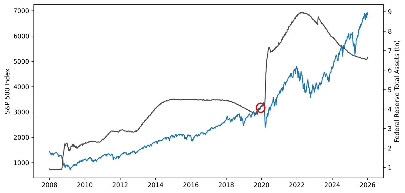 Shortly after ending quantitative tightening in November, the Fed announced on December 10 that, in order to maintain an ample supply of reserves over time, it would resume purchases of Treasury bills at a pace of USD 40bn per month until April, after which the pace will be reduced. This measure is supportive for markets, as it injects liquidity, lowers borrowing costs, and may signal reduced concern about undershooting the inflation target. Although the starting conditions differ, this episode of “technical QE” is similar in nature and scale to the programme implemented between October 2019 and March 2020, when the Fed purchased Treasury bills at a pace of USD 60bn per month to stabilise short-term funding markets (see chart below).
