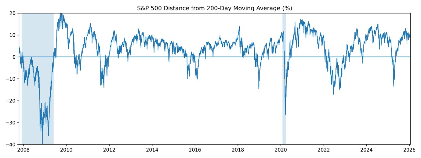 This publication focuses in greater detail on the US economy. While US equity valuations appear stretched from a technical perspective (see chart below), the fundamental backdrop remains supportive, underpinned by (i) a looser monetary policy stance from the Fed and (ii) strong economic growth driven by expansionary fiscal policy. This Goldilocks scenario, however, is akin to walking on thin ice. Should geopolitical risks, debt-sustainability concerns, or labour-market weakness materialise, a meaningful correction in equity markets may likely follow.